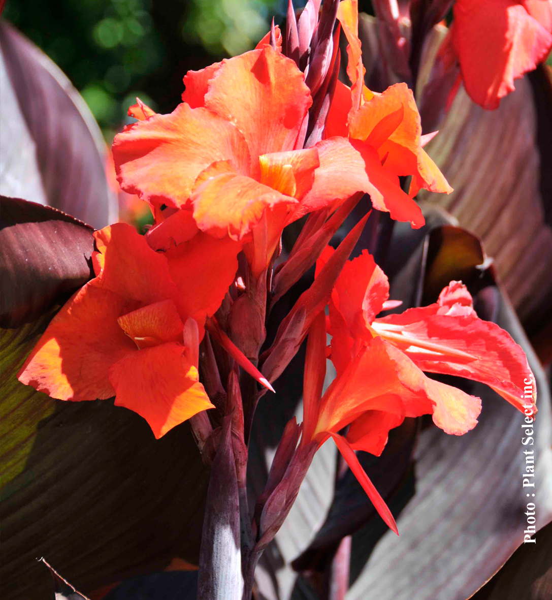 Fleurs orange flamboyant et feuillage bronze, légèrement nuancé de vert.