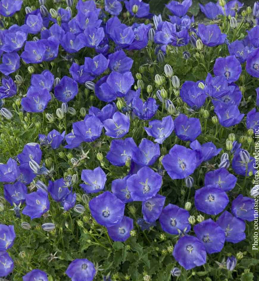 Plante formant un coussin bas. Grosses clochettes de fleurs bleu intense au-dessus du feuillage.