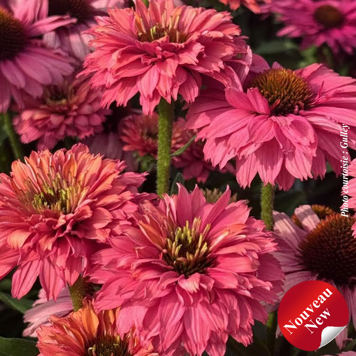 Robuste, aux fleurs doubles roses se teintant de saumon, floraison longue et attrayante pour les pollinisateurs.