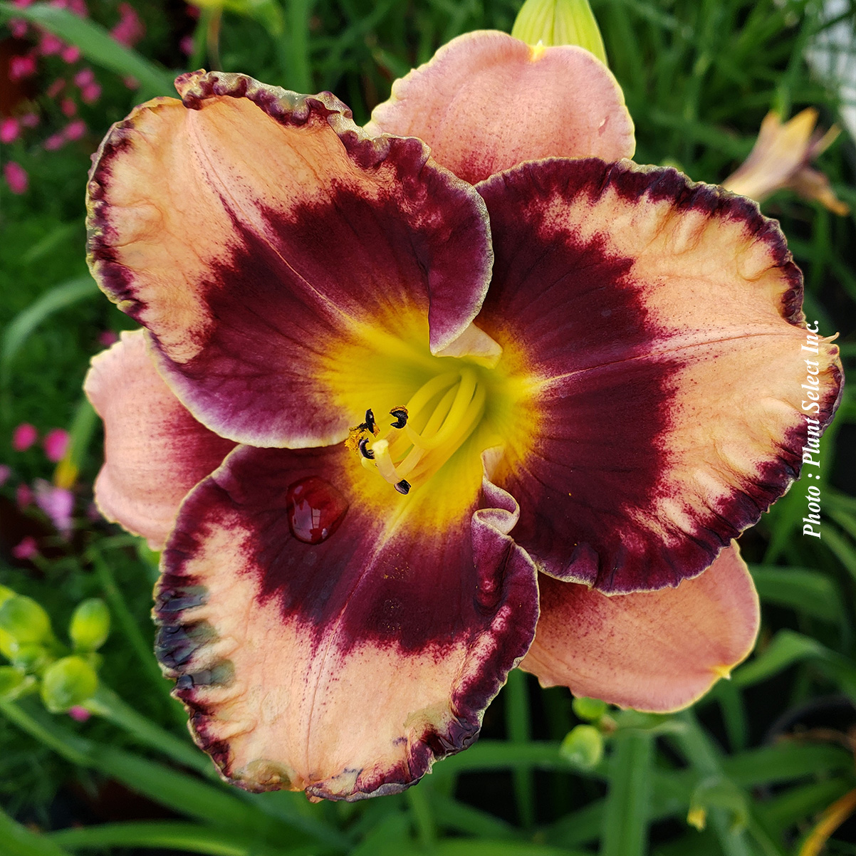 Fleurs saumonées ondulées, touches de pourpre et halo central intense. Très florifère et ramifiée.
