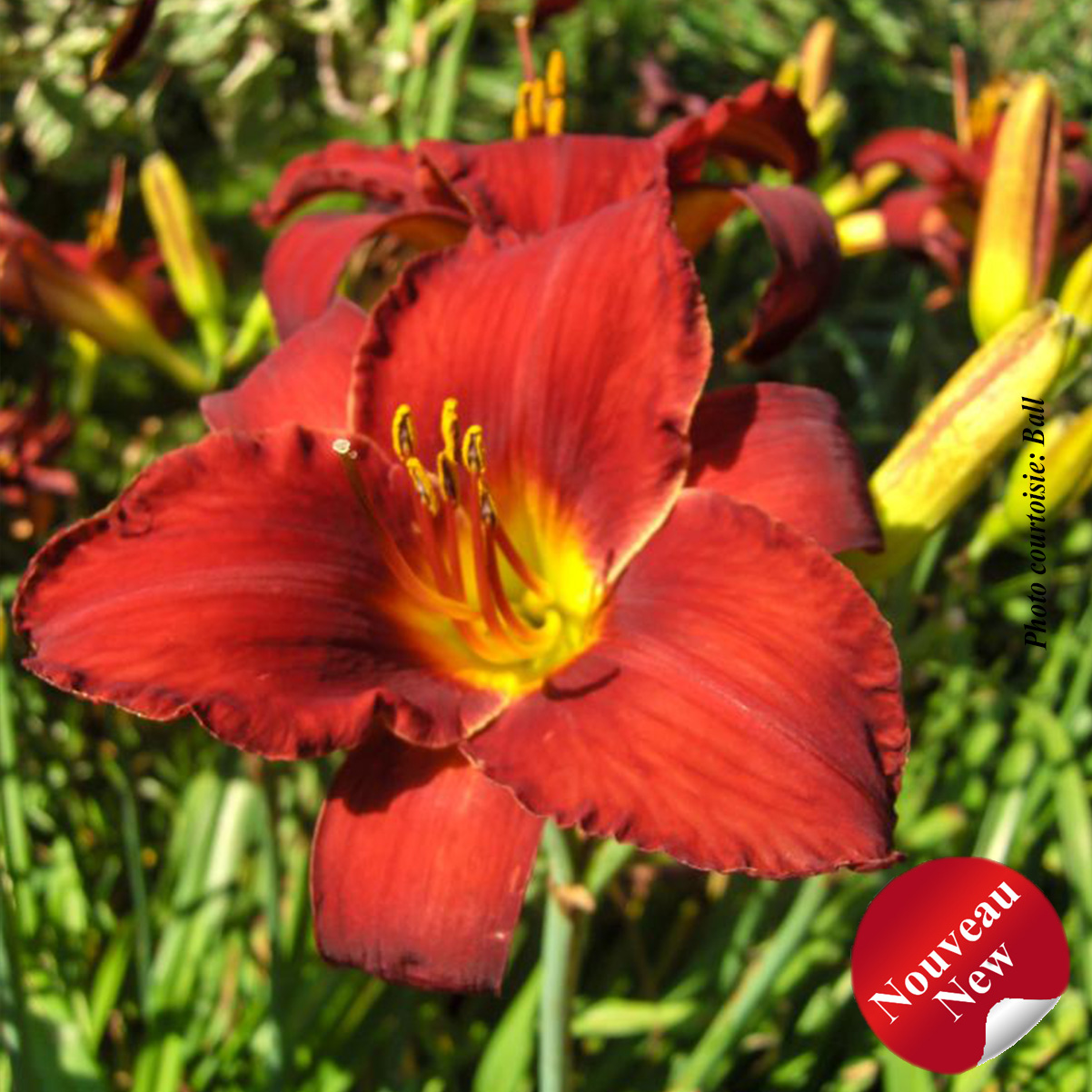 Diploïde. Les fleurs sont rouges avec une gorge jaune et verte, 8 cm de large.