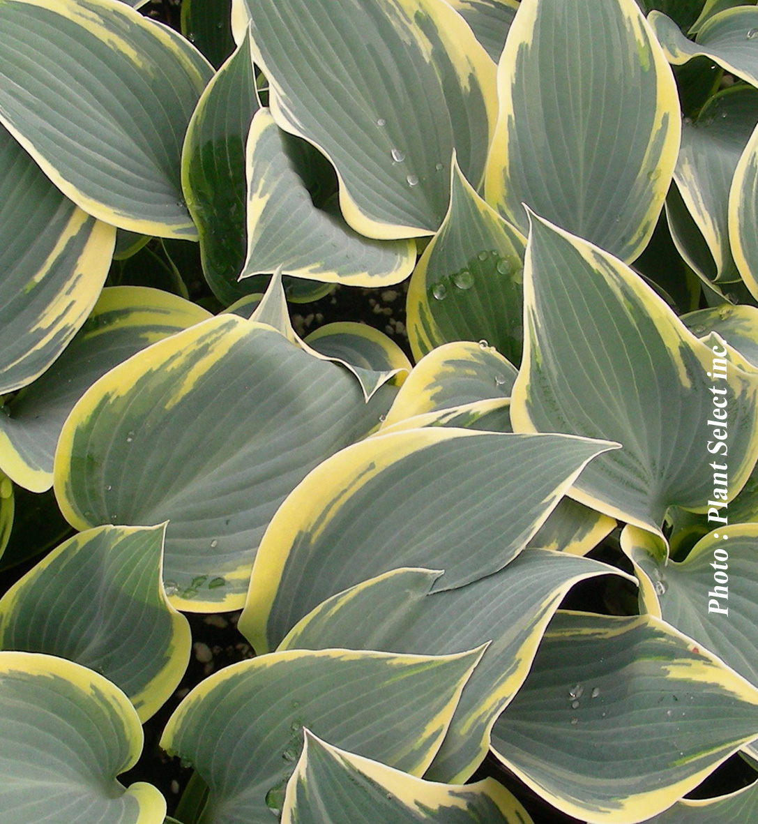 Feuilles jaune irrégulièrement et largement marginées de vert bleuté devenant vert foncé en été.