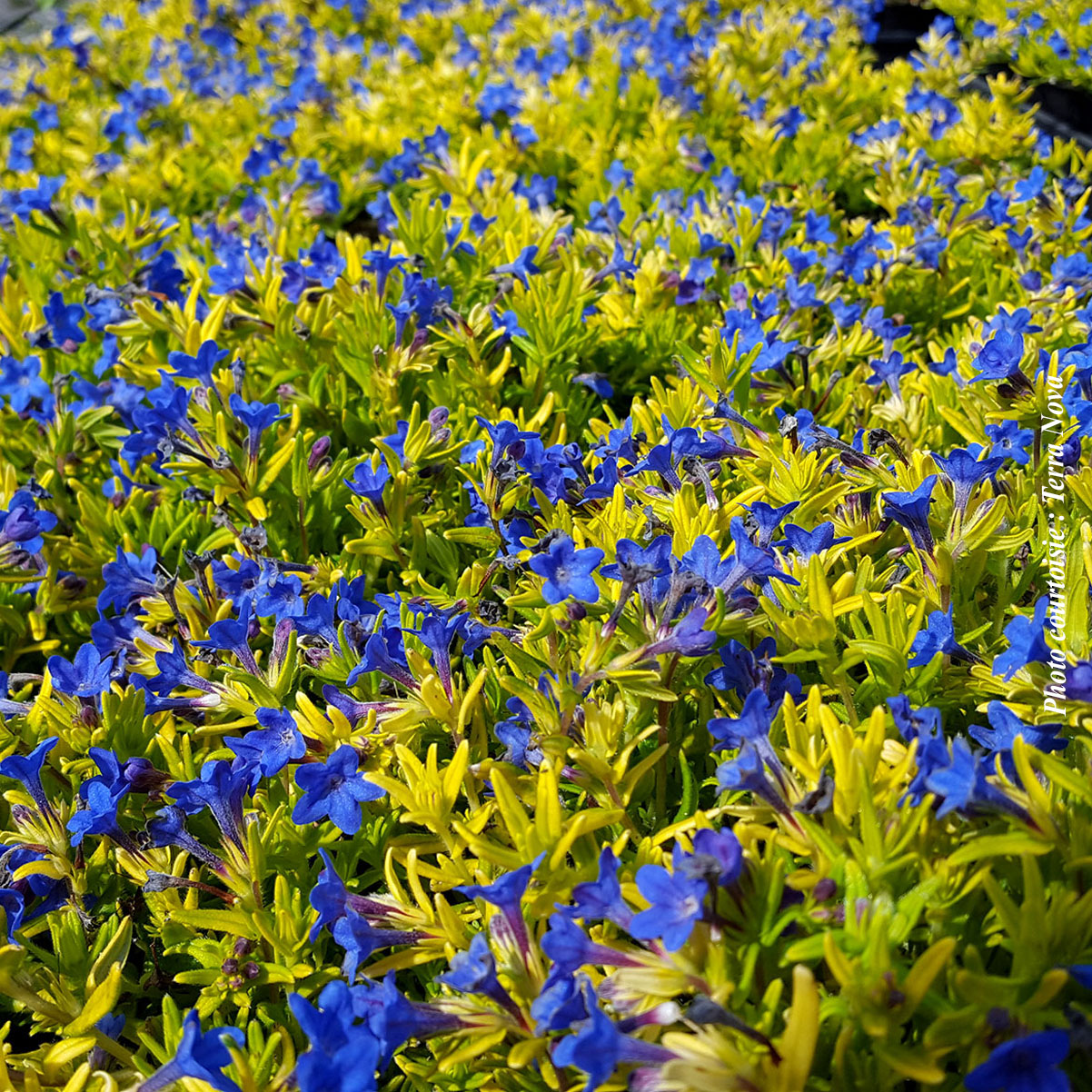 Couvre-sol aux fleurs d'un bleu profond qui contraste avec le feuillage doré en début de saison. Résistante à la chaleur et facile d'entretien.