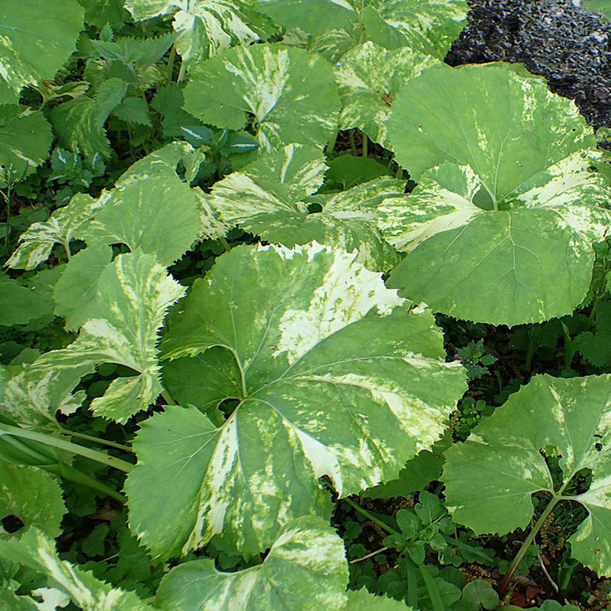 Plant de grande envergure. Feuillage nuancé de vert et de jaune crème. Floraison de couleur beige.