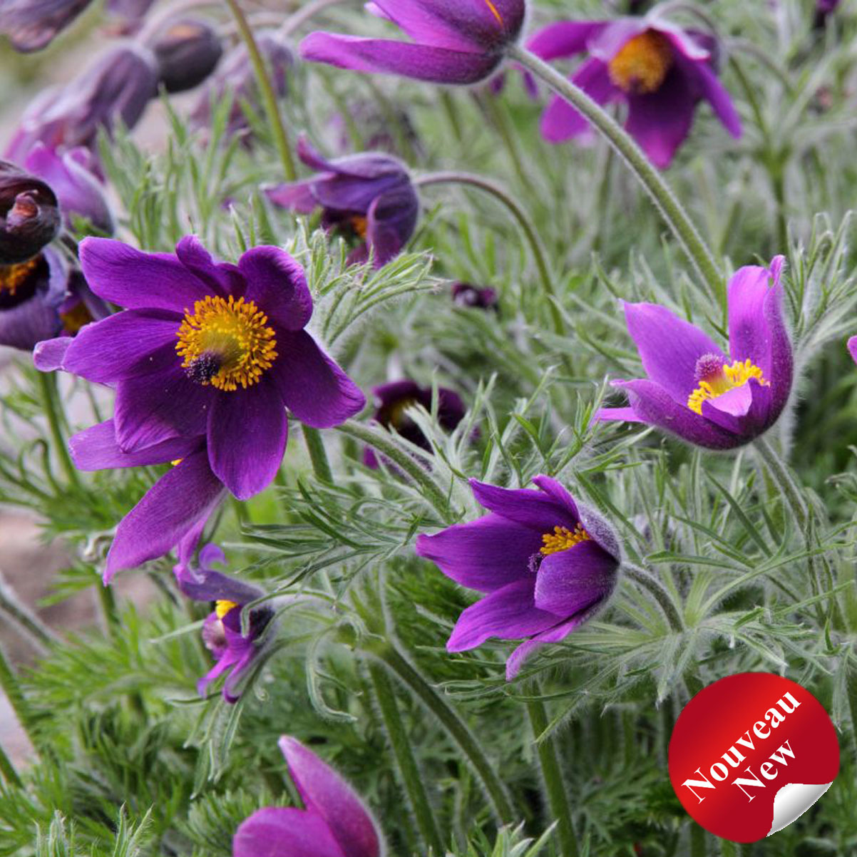Fleurs violet pourpre accentuées d’un cœur jaune, feuillage duveteux, rustique et facile d’entretien.